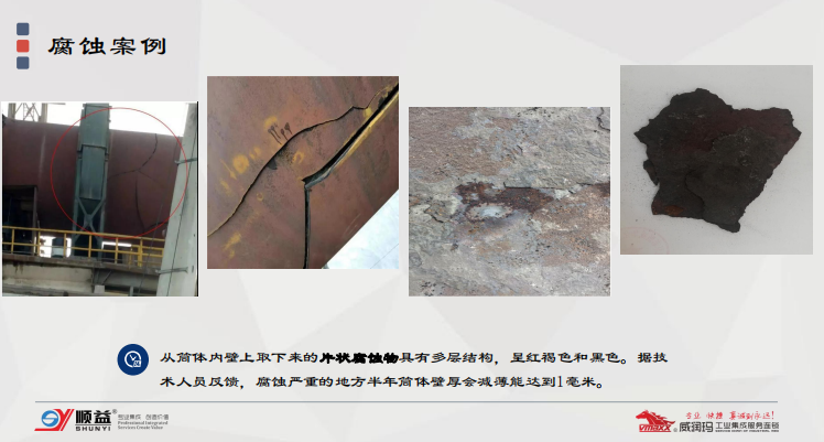 水泥回轉(zhuǎn)窯一般在1300℃以上的溫度中運(yùn)行,在內(nèi)襯耐火磚進(jìn)行耐磨、隔熱防護(hù)后窯筒外壁長(zhǎng)期處在300-400℃高溫,窯體除了耐火磚因窯體轉(zhuǎn)動(dòng)而產(chǎn)生的摩擦外,還會(huì)受到高溫氧化、高溫腐蝕、冷凝腐蝕及酸堿腐蝕情況,尤其是近些年對(duì)環(huán)保的重視,要求部分水泥廠協(xié)同處理焚燒生活垃圾產(chǎn)生含氟離子介質(zhì);又因燃煤的品質(zhì)情況,導(dǎo)致在焚燒的過(guò)程中,產(chǎn)生大量的含有氮氧化物、硫化物等氣象腐蝕介質(zhì),以上腐蝕介質(zhì)都加快了回轉(zhuǎn)窯筒體的腐蝕,也會(huì)對(duì)回轉(zhuǎn)窯的安全生產(chǎn)造成影響。